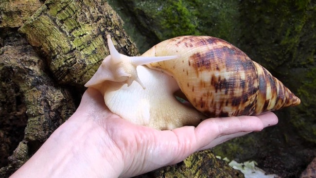 Ахатина – африканская сухопутная улитка, в российском климате выживает только в домашних условиях. Содержать такого питомца не составит труда. Считается, что улиткам нравится принимать теплые ванны, и они со временем учатся отличать своих хозяев от чужих людей. Нужно следить за тем, чтобы в аквариуме постоянно была пища: листья салата, яблоки, морковь, бананы. Взрослые особи могут питаться с кухни – огрызками и другими отходами овощей и фруктов. Летом домашних питомцев можно баловать зелеными растениями, одуванчиками, клевером, а зимой угощать травой для кошек. Если улиткам будет недостаточно еды, они будут медленно расти и могут впасть в спячку. Недоеденную или испорченную пищу лучше убирать сразу. Пьют ахатины простую воду. Для этого прямо в аквариуме желательно установить неглубокую ванночку. Выбирая жилплощадь для питомца, можно остановиться на аквариуме из оргстекла. Объем берется из расчета 10 литров на оду улитку. Обязательна верхняя крышка, чтобы питомцы не выползли из домика. А приток воздуха будет обеспечиваться через отверстия в стенках аквариума. На дно жилища кладут грунт толщиной до 10 см, чтобы ахатины могли закапываться в него. Там же они откладывают свои яйца.